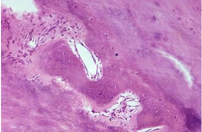 Fig.29:ISTOLOGIA DELLA TIMPANOSCLEROSI: CALCIFICAZIONE ED OSSIFICAZIONE L’ossificazione eterotopica appare come UN osso neoformato con trabecole irregolari. H & E 145 X. From Gallery
