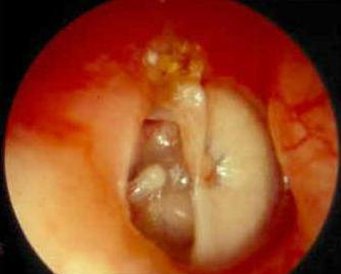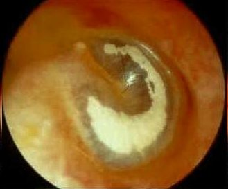 Fig.18:TIMPANOSCLEROSI ESTESA In questo paziente il resto della membrana timpanica mostra una timpanosclerosi diffusa. Una massa enorme di timpanosclerosi derivante dalla mucosa dell’orecchio medio può essere osservata attraverso la perforazione. From Gallery |