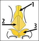 La piramide nasale è una struttura osteocartilaginea costituita dalle ossa nasali (1), dalle cartilagini triangolari (2) e alari (3) e dal setto che poggia inferiormente sull’osso mascellare.