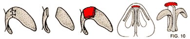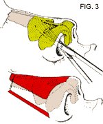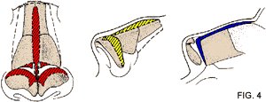 RINOPLASTICA CHIUSA PER VIA EXTRAMUCOSA Vengono eseguite in entrambe le narici per una lunghezza di meno di un centimetro per parte. Attraverso le incisioni si separano molto delicatamente (dissezione) (Fig.3) i tessuti molli del naso (cute, sottocute e muscoli) dalle strutture di sostegno osteo-cartilaginee (ossa nasali, cartilagini triangolari, alari e del setto).