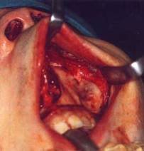 Presso il nostro centro quest’ultima metodica ha ormai soppiantato le prime due essendo una metodica che non comporta incisioni cutanee e quindi limitati inestetismi post-operatori. L’ approccio consiste in un’incisione sub-labiale dal primo molare di un lato sino al primo molare controlaterale. La cute della piramide nasale viene scollata con tecnica di Rinoplastica. Una volta scollati, i tessuti molli vengono sollevati verso l’alto ( “Degloving” significa proprio sguantamento ) e si pratica uno sportello osseo che da’ ampio accesso al tumore; questo sportello verra’ poi riposizionato al termine dell’ intervento con placche in titanio. Il tempo di exeresi tumorale viene eseguito con tecnica microscopica associata talvolta all’ ausilio di ottiche endoscopiche.